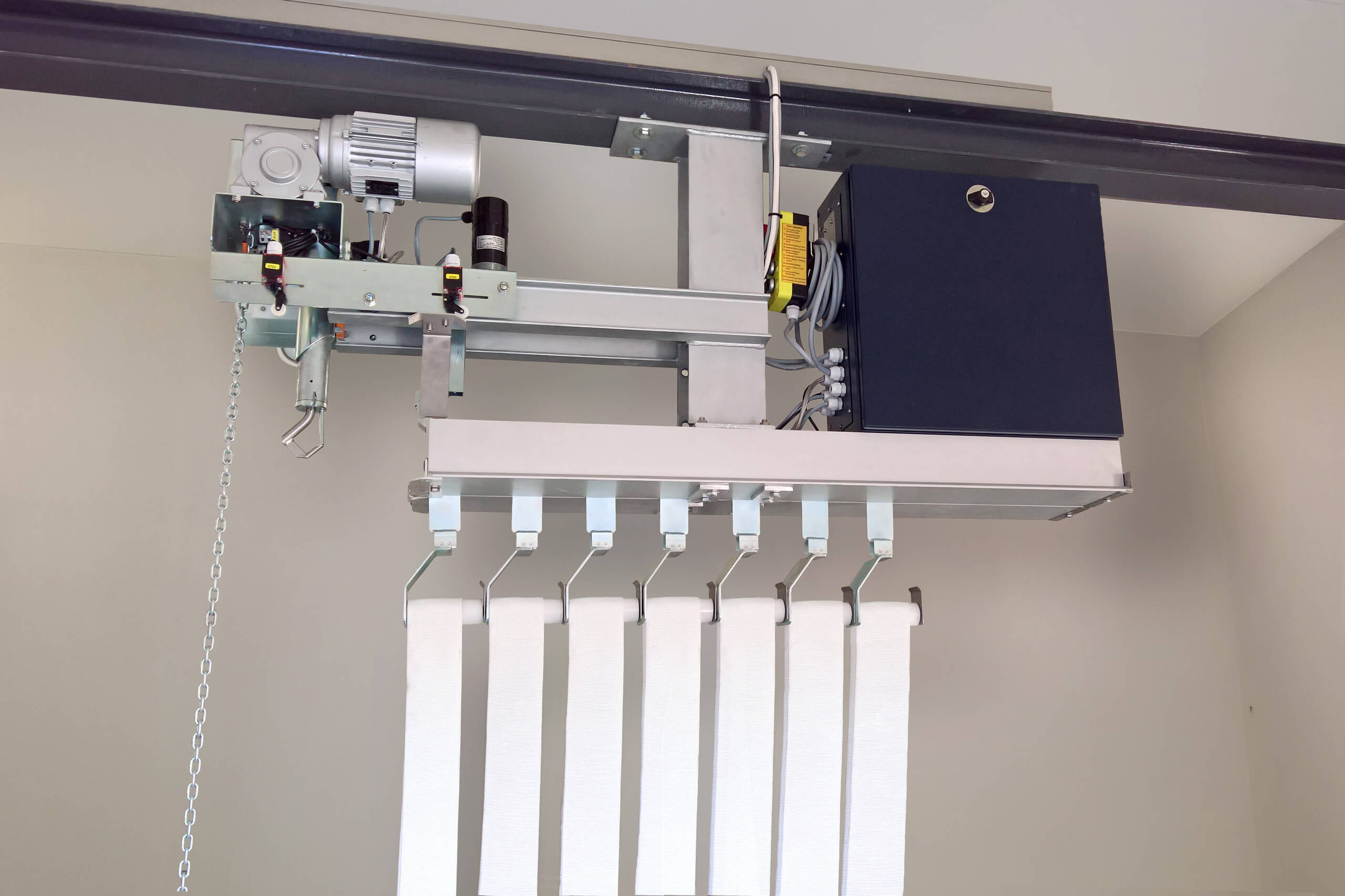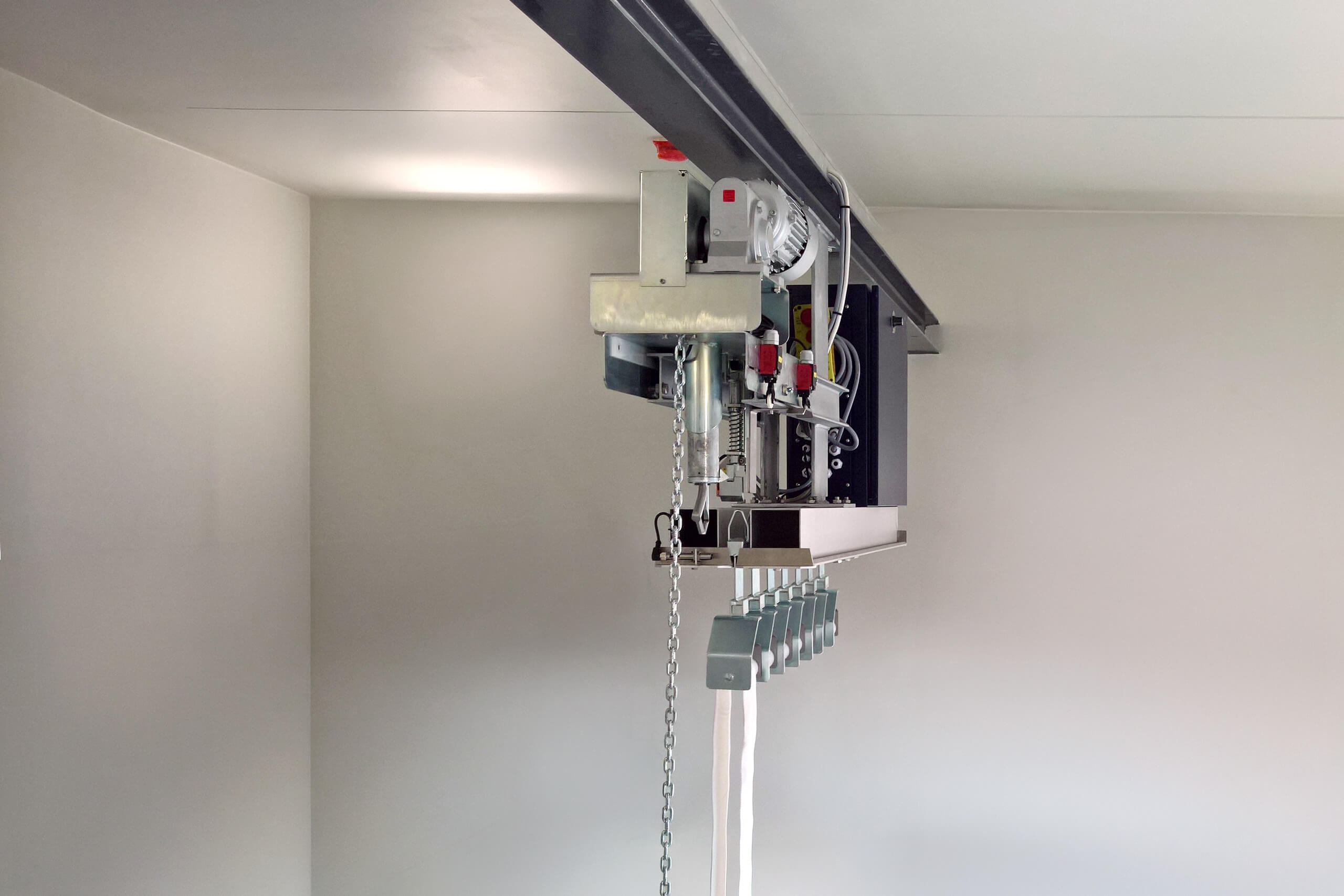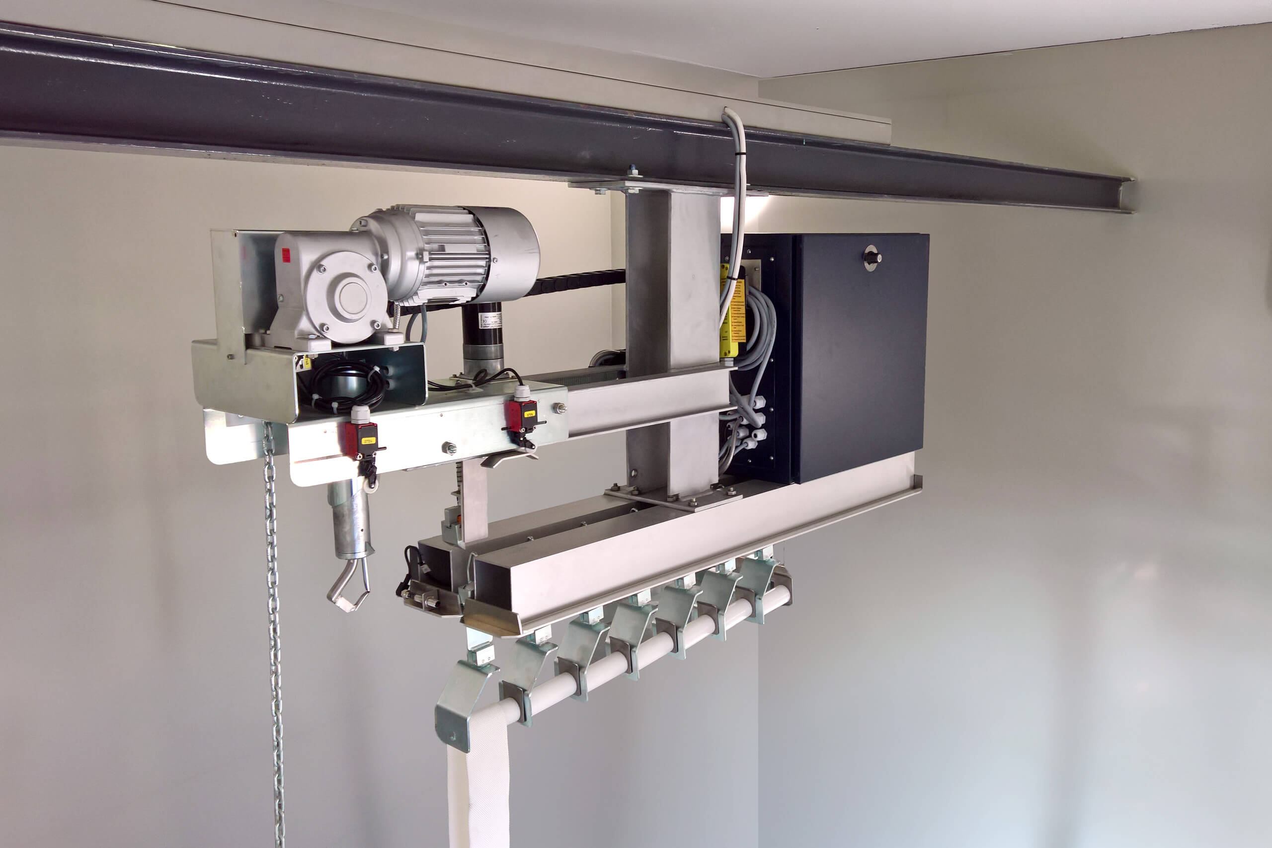 Der KSL arbeitet mit einem einzigartigen Aufhänge‑ und Bahnenträgerkonzept und lässt sich nahtlos in den Reinigungsprozess konventioneller Schlauchpflegeanlagen und Schlauchpflegegeräte integrieren.