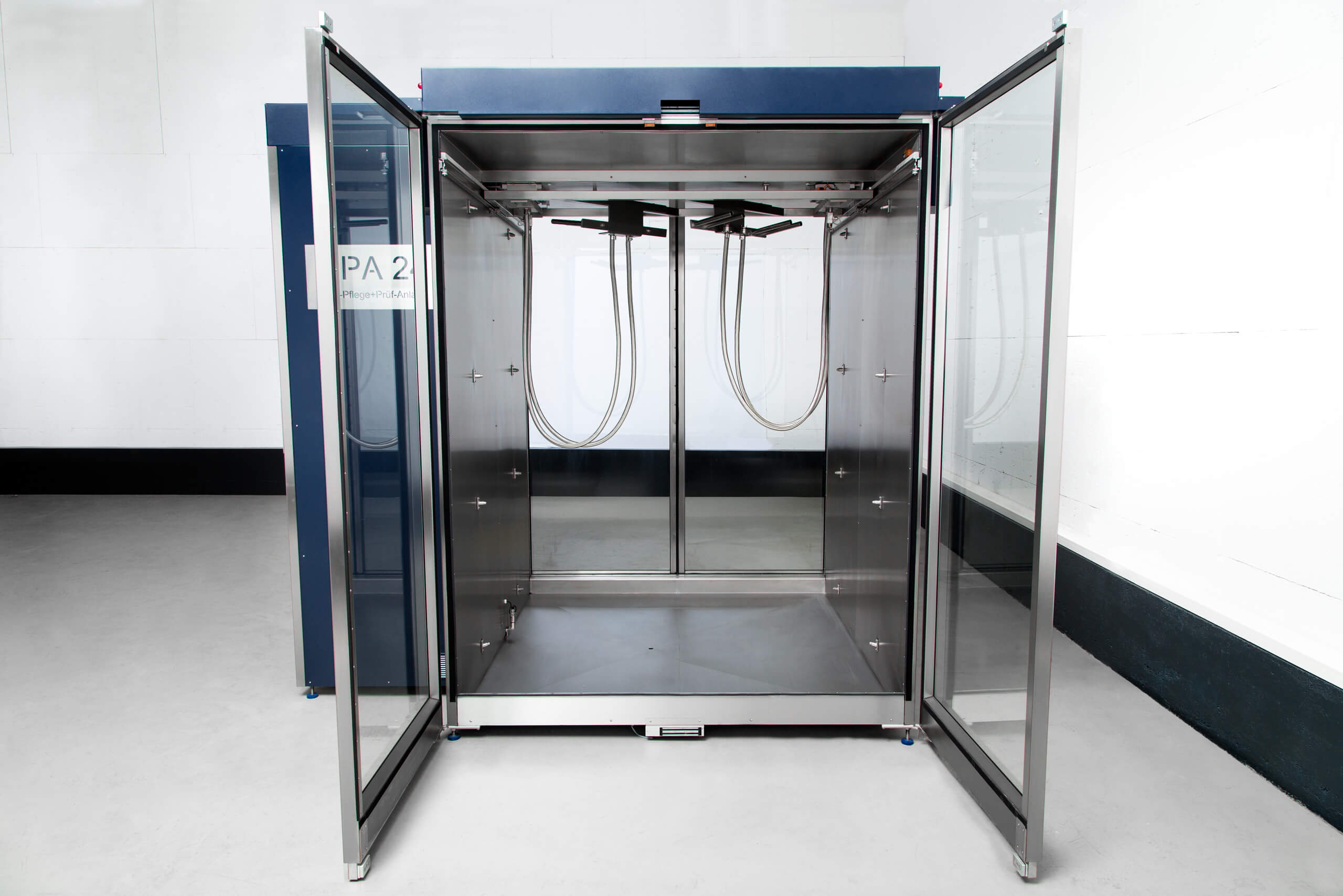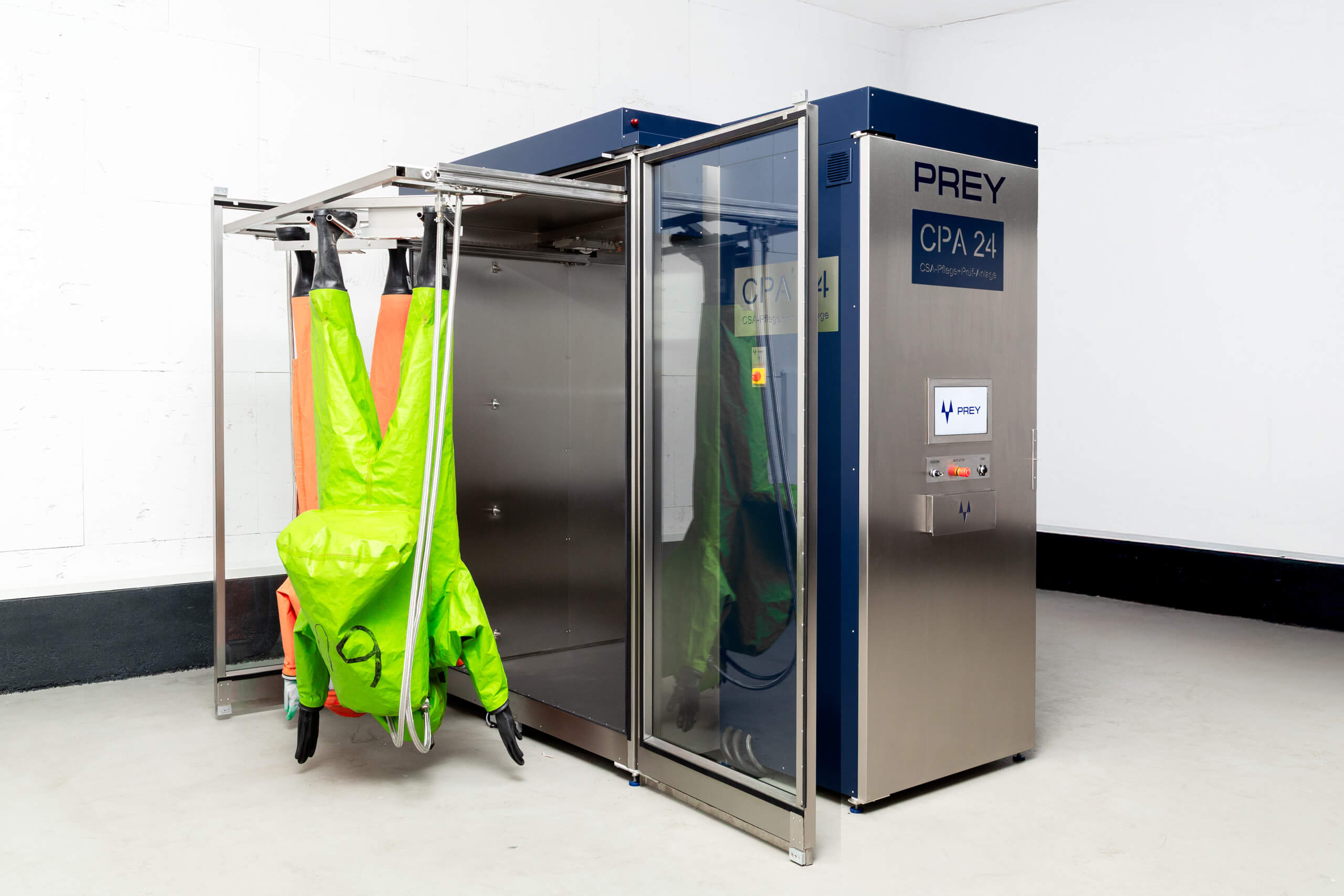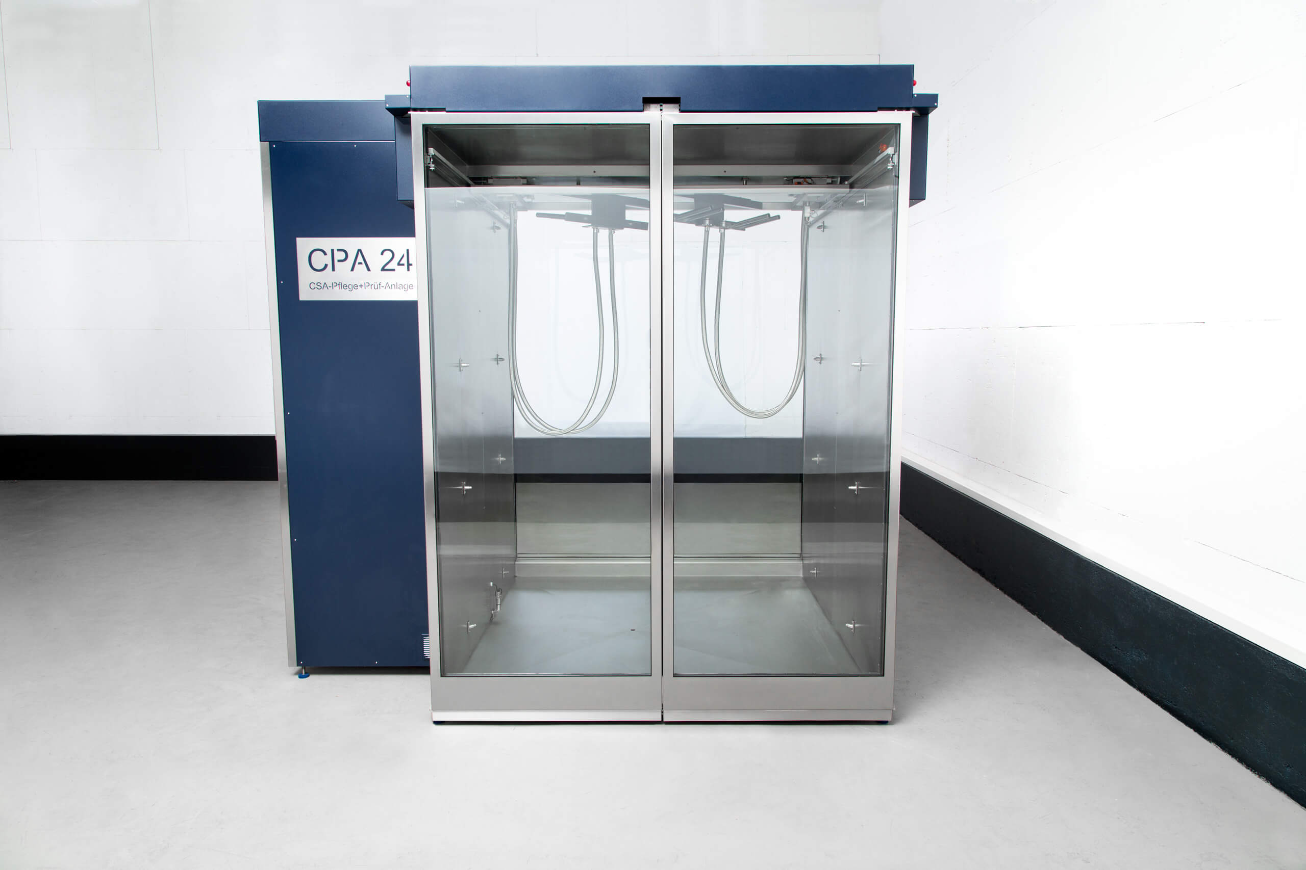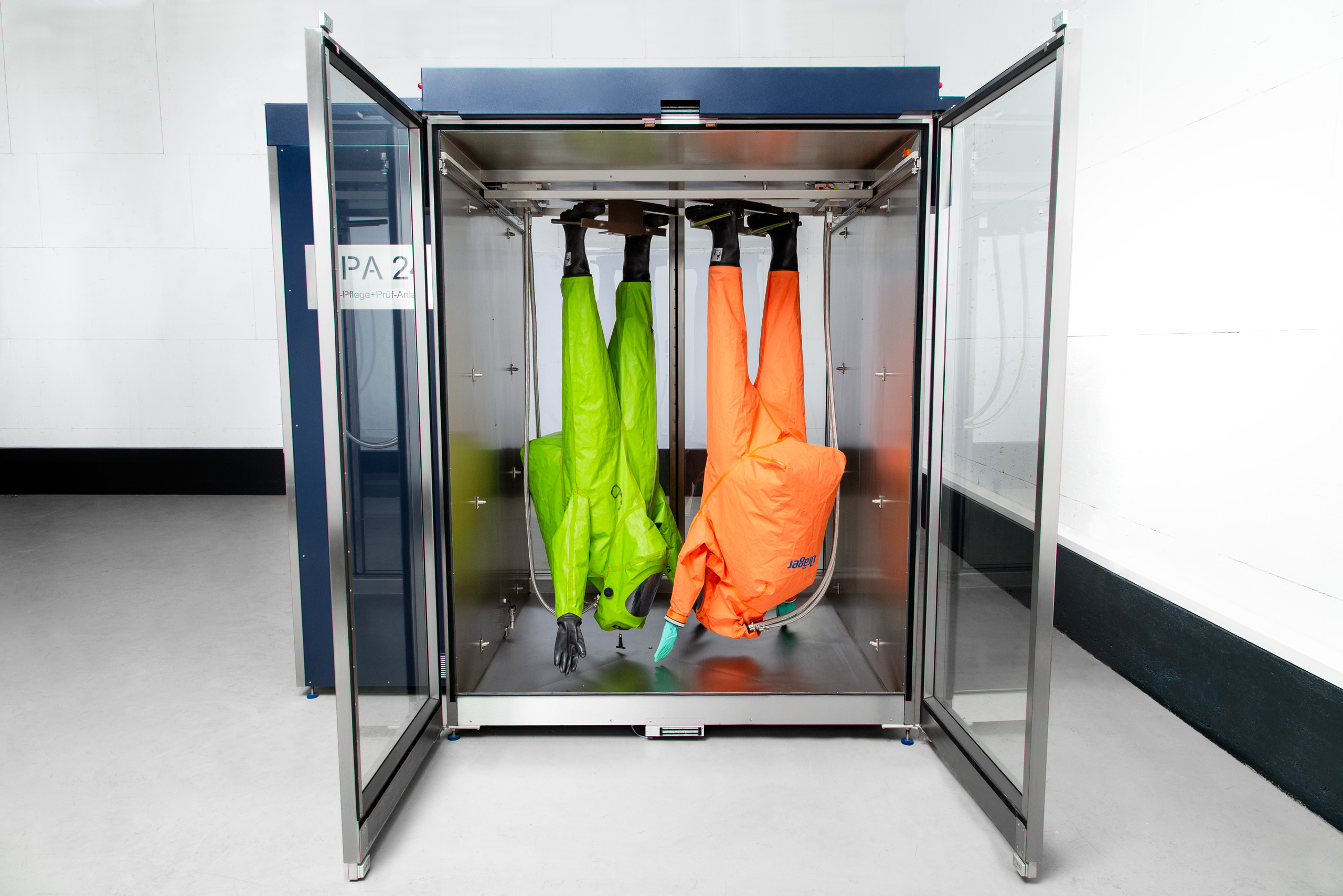 Die CPA 24 ist die erste und bislang einzige Anlage, die Chemikalienschutzanzüge nicht nur vollautomatisch pflegt, sondern im selben Prozess auch ihre Dichtigkeit prüft. Möglich wird dies durch eine speziell entwickelte, thermisch geführte Dampfreinigung, -desinfektion und Trocknung, bei der Luft, Wasser und Dampf über die Auslassöffnungen der Anzüge geführt werden – mit und ohne Reinigungs- und Desinfektionsmedien.