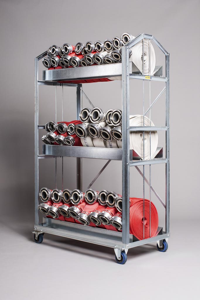 Das Standardregal für die stationäre Lagerung von Feuerwehrdruckschläuchen aller gängigen Größen und Längen in verzinkter Ausführung zur Erweiterung der PREY-Produktpalette.