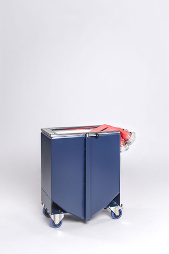 Der Kassetten-Vorweich-Abwickelwagen mit einem Schlauchfach für drei A- bzw. zwei F-Schläuche in hoher Ausführung für den ebenen Einzug in die Hochdruckwaschmaschine der Schlauchpfegevoll- und -halbstraßen vom Typ PRO 2, der fahrbaren Schlauchwaschmaschine und sämtlicher Kombigeräte ohne festen KVA.