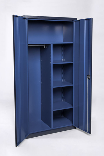 Der KSK besteht aus einer pulverbeschichteten Blechkonstruktion im RAL-Ton der PREY-Anlagen- und -Gerätetechnik. Er verfügt über einen halbseitigen Hängeteil für Kleidung mit Hutablage und vier halbseitigen Fächer.