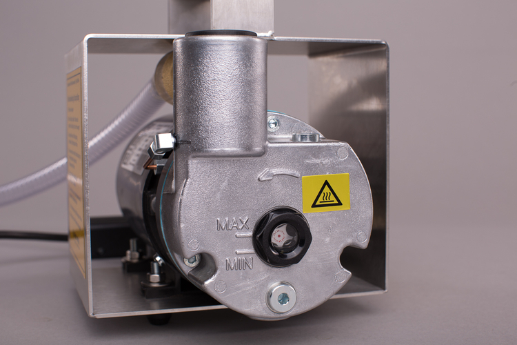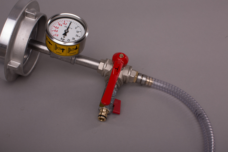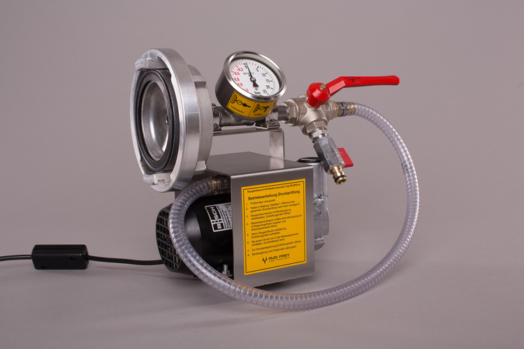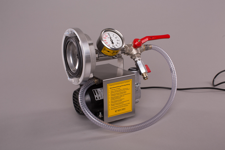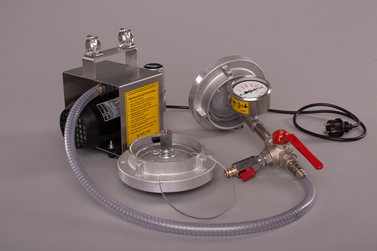 Das tragbare Gerät ist betriebsbereit mit zwei Meter langem Anschlusskabel und Schutzkontaktstecker ausgestattet. Es besteht aus Motor-Vakuumpumpe mit Schwingpufferfüßen, ein Meter langem Vakuum-Spiralschlauch, einer Prüfarmatur als A-Blindkupplung mit T-Rohrteil, Mano-Vakuummeter und Drei-Wege-Kugelhahn mit Schnellkupplung zur Druckprüfung sowie A-Blindkupplung mit Entlüftungshahn zur Druckprüfung. Die Verrohrung ist in Edelstahl ausgeführt.