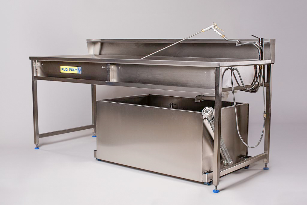 Wannenteil aus VA 1.4301 mit umlaufender Mehrfachkantung, Eckstöße ansatzlos verschweißt und poliert, Lochblecheinlage für Vorreinigung 2 Wannenabläufe für: Ablass in Normal-Abwasser-Kanal Ablass in Entsorgungsbehälter oder bauseitigen Abscheider